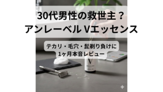 30代男性のテカリ、毛穴の開き、髭剃り負けに悩む方向け。アンレーベルラボ Vエッセンス(高濃度ビタミンC美容液)を1ヶ月使用したメンズの正直レビュー。ベタつかない使用感と皮脂抑制、毛穴引き締め効果を解説します。