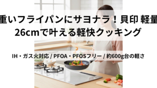 貝印KAI軽量フライパン26cm(DW5629)を1年使った本音レビュー。重さ約600g台で手首が楽に!高熱効率・PFOA/PFOSフリーで安心。実際に使って分かったメリット・デメリット、長持ちさせるコツを詳しく解説します。