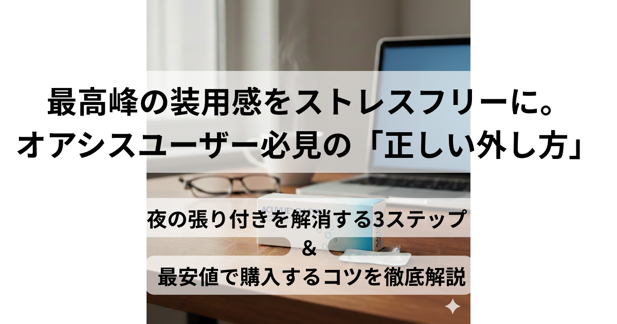 そこで本記事では、まずオアシスが外しにくい原因を客観的に分析します。さらに、眼科医も推奨する「一瞬で外すプロの技」を伝授します。最後に、最もコスパ良く継続できる90枚パックの購入法をご紹介しましょう。この記事を読めば、もう外れない恐怖に怯える必要はありません。